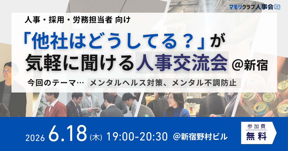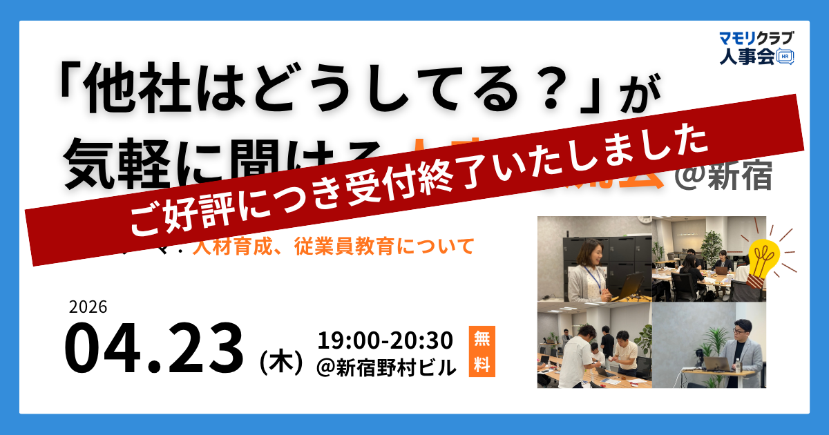 直近開催のイベント 【第15回】人事・採用の「他社はどうしてる?」が気軽に聞ける交流会|2026年4月23日(木)東京開催 【第16回】人事・採用の「他社はどうしてる?」が気軽に聞ける交流会|2026年5月21日(木)東京開催 【第17回】人事・採用の「他社はどうしてる?」が気軽に聞ける交流会|2026年5月26日(火)大阪開催 もっと見る