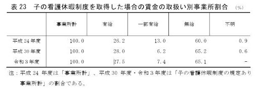 2021年に厚生労働省が実施した「雇用均等基本調査」によると、子の看護休暇を「無給」としている企業が65.1%、「有給」が27.5%、「一部有給」が7.4%という結果が出ています。
