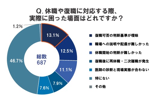 「休職や復職に対応する際、実際に困った場面はどれですか?」という設問に対し、対応において最も多かった回答は「特にない(46.7%)」でしたが、