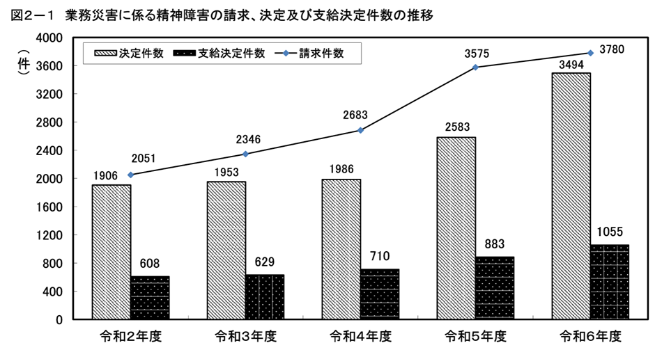 業務災害に係る精神障害の請求、決定及び至急決定件数の推移(令和7年6月25日・厚生労働省)https://www.mhlw.go.jp/content/11402000/001508121.pdf